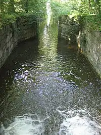 The western part of the southern canal feeds Lake Badenburg. Apart from the small amount of water that drains via the small stream near the Pan sculptures, the canal extension diverts the waters of the lake towards the east. During the Baroque period it served as a small waterway. Gondolas and boats navigated here in the service of members of the court. The small watercraft used a sluice to overcome the difference in height between Lake Badenburg and the central basin on the Garden parterre.[21]