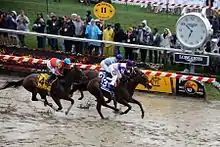 At the 2016 Preakness Stakes, on a wet track, Nyquist became the victim of a blistering early pace and came in third behind winner Exaggerator and second-place finisher Cherry Wine.[22] Nyquist developed a fever the day after the Preakness and Doug O'Neill decided to postpone shipping Nyquist to Belmont Park.[23] Nyquist was withdrawn from the Belmont Stakes on May 24 after developing a high leucocyte count.