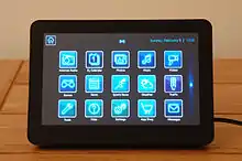 The interface consists of a home button, the date and time, a Wi-Fi indicator (if connected wirelessly) and app buttons arranged in three rows of five. If more than 15 applications are installed a scroll button is displayed, allowing the user to access the additional buttons. Additional notification icons can be displayed to the right of the home button, such as a musical note indicating that the radio app is playing in the background.