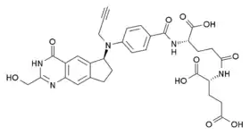 - Tochowicz A, Dalziel S, Eidam O, O'Connell JD, Griner S, Finer-Moore JS, Stroud RM (July 2013). "Development and binding mode assessment of N-[4-[2-propyn-1-yl[(6S)-4,6,7,8-tetrahydro-2-(hydroxymethyl)-4-oxo-3H-cyclopenta[g]quinazolin-6-yl]amino]benzoyl]-l-γ-glutamyl-D-glutamic acid (BGC 945), a novel thymidylate synthase inhibitor that targets tumor cells". Journal of Medicinal Chemistry. 56 (13): 5446–55. doi:10.1021/jm400490e. PMC 3880649. PMID 23710599.