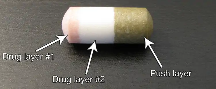 Both the EOP and CPOP were relatively simple designs, and were limited by their inability to deliver poorly soluble drugs.[1] This led to the development of an additional internal "push layer" composed of material (a swellable polymer) that would expand as it absorbed water, which then pushed the drug layer (which incorporates a viscous polymer for suspension of poorly soluble drugs) out of the exit hole at a controlled rate.[1][4] Osmotic agents such as sodium chloride, potassium chloride, or xylitol are added to both the drug and push layers to increase the osmotic pressure.[1][4][5] The initial design developed in 1982 by ALZA researchers was designated the Push-Pull Osmotic Pump (PPOP), and Procardia XL (nifedipine) was one of the first drugs to utilize this PPOP design.[1][2]