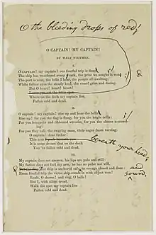 ![]() Printed copy of "O Captain! My Captain!" with revision notes by Whitman, 1888[1] | |