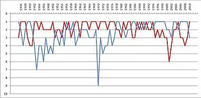 The inception of the Primeira Liga saw Porto win the very first edition of the competition.[5] Both sides met for the first time in the competition on 3 February 1935, on which Porto won 2–1.[6] Benfica would win the return tie 3–0. Despite Benfica's win, the Águias would finish third in the league, three points behind Porto.[7] The next five seasons would see Benfica win three titles to Porto's two. During the 1940s, both sides would take a back seat to Sporting CP, which would win five league titles in the decade.