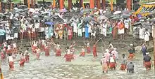 Oachira Kali is a festival that takes place in June in Oachira, Kerala, India.[1] It is a mock battle between two groups, to the sound of drums, in a waterlogged field called padanilam at the Oachira Temple.[2] Oachira Kali is celebrated in commemoration of the battle of Kayamkulam, fought between the Maharaja of Travancore Marthanda Varma and the Raja of Kayamkulam on the plains of Oachira Temple.[3] The Padanilam or battlefield is a paddy field adjacent to the famous Oachira Parabrahma temple and the festivities are part of a ritual associated with the shrine.