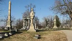 The cemetery is now the resting place for countless notable Evansville residents, as well as an American Civil War burial ground with over 500 Union troops, 24 Confederate soldiers, and 94 civilians who died during Civil War conflicts.[3] In 1868, the city began efforts to secure designation of the Union veterans’ areas as federal property, eventually succeeding with a Congressional appropriation and recognition in 1898. Several years later, in about 1903, the Fitzhugh Lee Chapter of the Daughters of the Confederacy erected a monument in remembrance of the 24 soldiers who died for the South. A larger memorial for local Union dead was added in 1909.[2] The 24 Confederate soldiers buried here were prisoners of war who died in Evansville.[4]