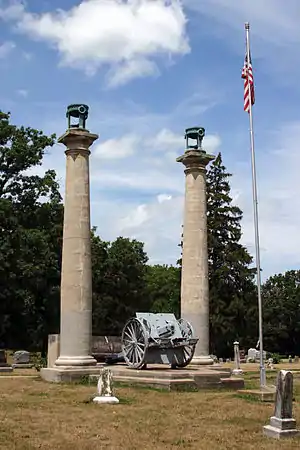 Located at the south entry of the cemetery is a memorial to Edgar Lee Masters, highlighting his close relationship to the cemetery. Nearby is a "Looking for Lincoln" exhibit that is devoted to Masters. In a central part of the cemetery there is a Civil War memorial that includes a pair of sandstone columns (the so-called "Lincoln pillars"[2]) that were quarried from the Spoon River bottom. These columns were salvaged from the old Fulton County courthouse (actually, the third courthouse in Lewistown), which was burned by a fire of uncertain origin on December 13, 1894.[8] On separate occasions, Abraham Lincoln and Stephen A. Douglas each gave speeches from between the columns when the columns were in their original location in front of the courthouse.[9] Lincoln's famous "Back to the Declaration of Independence" speech was given there on August 17, 1858.[10]
