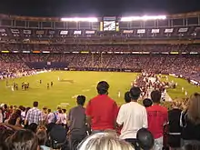 On May 11, 2021, the MLB permitted the A's to explore relocation possibilities should the team fail to get a replacement stadium for the aging Coliseum from the city of Oakland by 2024.[26] Among the cities and regions in consideration by the team was the Las Vegas Valley area of Nevada, the home of the National Hockey League's Vegas Golden Knights and the National Football League's Las Vegas Raiders, with the latter team having left Oakland in 2020 due to being unable to get a football-only stadium in the city. The team previously played six home games at Las Vegas' Cashman Field during the 1996 MLB season when the renovations for the Coliseum were not yet complete.[27] Several days later, the A's started exploring the possibility of relocating to the Las Vegas area and would later organize meetings with local government officials and tour potential sites there led by team owner John Fisher in the next week.[28] After a presentation at a June MLB owners meeting in New York City, team president Dave Kaval said that the A's were considering the Resort Corridor, the Cashman Field site and the Valley cities of Henderson or Summerlin, Nevada as possible locations for a ballpark. Kaval also said that the team was still continuing to explore "parallel paths" in not just Las Vegas but the team's long time home Oakland.[29] Kaval and Fisher would conduct more trips to the area to meet with officials again over the possibility of relocation starting with June 20 and 21.[30][31] By then, the A's shortlist for a potential ballpark in Southern Nevada ballooned to over 30 sites according to Kaval.[32]