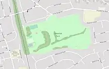 In the late 1860s, the merchant Samuel Sugden (c.1800-1896) purchased a farm and farmhouse in the area,[2] probably the one marked on an 1822 Ordnance Survey map as Oak Farm.[3] He rebuilt the house into a much more substantial residence known as Oak Lodge with a walled garden, orchard, ice well, and a collection of outbuildings.[2] The Lodge and outbuildings were demolished just after the end of the First World War[2] and in 1927 Southgate Urban District Council purchased 50 acres from Sugden's estate[4] which it combined with 8.5 acres it purchased from the Vicar of Enfield to form Oakwood Park.[2] The park opened in 1929 and after further adjustments caused by the construction of the Piccadilly Line northern extension (1932) now comprises 64 acres of land.[2] The ice well still exists[5] as do some of the original field boundaries dating from Sugden's time.[6]