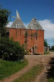 Internal kilns were built of timber or bricks.[24] External kilns were built from bricks, ragstone and bricks, flint, or sandstone.[22] A rare material usage was at Tilden Farm, Headcorn where the kiln was built from Bethersden Marble. During the Second World War, a few kilns were built with a basic timber framing and clad in corrugated iron (Crittenden Farm, Matfield).[24]