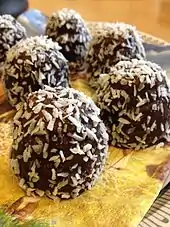 One traditional name for the pastry in Swedish is negerboll ("negro ball").[4] Due to possible racist connotations, this name has fallen out of favor in recent decades, with chokladboll (chocolate ball) now being the most commonly used name. When made with shredded coconut, it is also known as kokosboll (coconut ball).