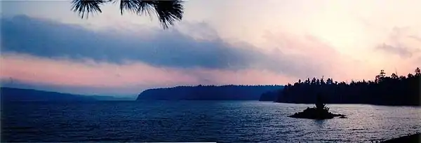 | Etymology | Ojibwe for "One lake that is almost two" |