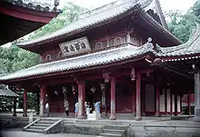 The development of the Ōbaku-shū in Japan began somewhere around 1620, a period when Chinese emigrants were coming to Nagasaki due to a decree by the shogunate allowing Chinese traders to conduct business there. The Chinese traders, in turn, began to request that monks from China come to Nagasaki "to serve the religious needs of their community and build monasteries in the late-Ming style with which they were familiar."[8] The Chinese community was therefore thrilled when the founder of the Ōbaku, a master of the Linji school/sect named Yinyuan Longqi (J. Ingen Ryūki), arrived from China in Nagasaki in 1654 with a small group of his Chinese students. Furthermore, Yinyuan himself was happy to get away from China, which was then amidst a terrible war.[8] Yinyuan was there with the explicit purpose of helping three underdeveloped temples founded by Chinese emigrants grow in the city. These Nagasaki temples were known as the three "temples of good fortune," respectively Kōfuku-ji, Fukusai-ji and Sōfuku-ji.[9] In time many Japanese heard of his teachings and traveled to Nagasaki to see him, while some came to join his community and become students.[10] Having planned to stay in Japan for a short period of time, Yinyuan was persuaded by a group of his Japanese students to remain in Japan; this group secured him governmental permission to relocate to Kyoto, where his student Ryūkai Shōsen wished he would then become abbot of the Rinzai temple Myoshin-ji. Authorities within the Rinzai organization were not keen on this idea, due primarily to a disagreement within the congregation as to whether or not Yinyuan presented a take on Zen that was too distinctly Chinese for Japanese tastes.[9] As a consequence, Yinyuan began construction of the modern day head temple of the Ōbaku known as Ōbaku-san Manpuku-ji in 1661 in Uji of Kyoto prefecture (Ōbaku-san being the mountain name). This marks the emergence of the Ōbaku school/sect of Zen Buddhism in Japan.[10]