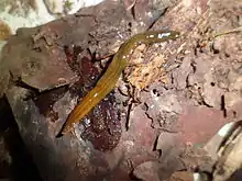 In young specimens, the dorsal ground color is yellowish. A dark-brown to black median stripe runs longitudinally along the body. Additionally, there is a wide lateral longitudinal band of the same color of the stripe on each side. The stripe and the bands usually do not reach the anterior tip, which has an orange tinge more or less concentrated, sometimes forming a dense zone that resembles a collar.[1]