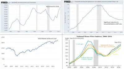 Wealth inequality had also risen similarly, with the share of wealth owned by the top 1% rising from 24% in 1979 to 36% by 2007.[15] While U.S. household net worth rose nearly 30% from its pre-crisis peak in 2007 to 2016,[18] much of this gain went to the wealthiest Americans, as it had prior to his tenure. By 2015, the share of wealth owned by the top 1% reached 42%.[15]