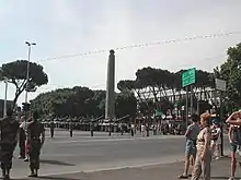 When it was reassembled in Rome in 1937, three steel bars were inserted per section. When the obelisk was hit by lightning during a violent thunderstorm over Rome on 27 May 2002, this caused "considerable" damage.[15] In the new reconstruction the three sections are fixed together[16] by a total of eight aramid fiber (Kevlar) bars: four between the first and second and four between the second and third sections. This arrangement guarantees structural resistance during earthquakes and avoids the use of steel, so as not to again make the stele a magnet for lightning and to avoid rust.