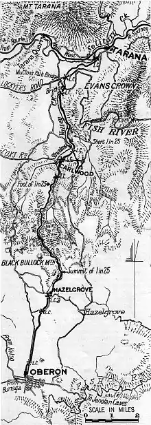 The Oberon railway line is a short, disused branch railway line on the Central Tablelands of New South Wales, Australia. The line branches from the Main Western line at Tarana railway station and heads in a southerly direction to Oberon railway station, with length of 24 km. It was earlier put forward as a line from Tarana to Burraga, via Oberon, to benefit the Burraga copper mine.[3] It opened on 3 October 1923,[2][1] after the copper mine at Burraga had closed down.[4] The line was lightly constructed with steep grades (1 in 25) and tight curves, and was operated by lightweight steam and then diesel locomotives.[5] It transported local seasonal vegetables, timber and livestock. Passenger services ended in 1971, and goods services were suspended in 1979 with the line effectively closing. The line is currently being restored by a volunteer association to allow heritage and tourist operation.[6]