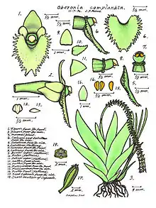 The southern green fairy orchid was first formally described in 1839 by Allan Cunningham who gave it the name Dendrobium complanatum and published the description in Edwards's Botanical Register.[5] In 1989 Mark Clements and David Jones changed the name to Oberonia complanata.[6] The specific epithet (complanata) is a Latin word meaning "flattened".[7][8]