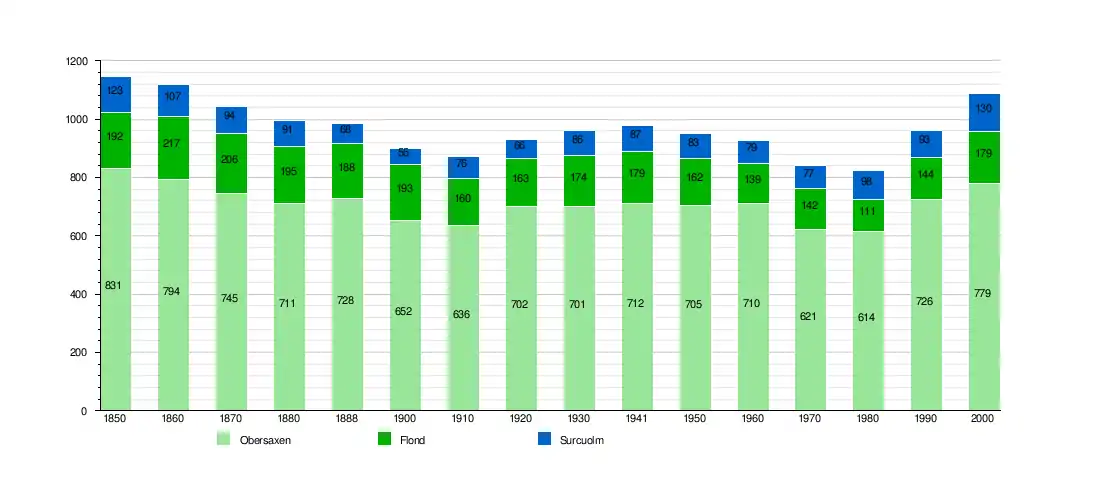 The historical population of Obersaxen and the two former municipalities that made up Mundaun, Flond and Surcuolm, is given in the following chart:[10]