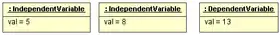 In the second diagram, at a slightly later point in time, the IndependentVariable and DependentVariable objects are the same, but the slots for the val attribute have different values. The role names are not shown here.