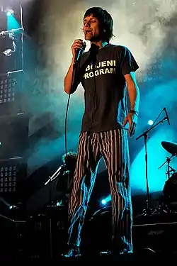 The band's latest studio album, Kako to misliš: mi (What Do You Mean: We), was released on 6 April 2012. The album was released for download from the Exit music record label, and on CD through Odličan Hrčak record label.[13] It contains a rerecording of the song "Ja sam idiot" from Najvažnije je biti zdrav.[13] In 2013, the band's first guitarist, Aleksandar Jocić "Cana" returned to the band, the starting to perform in the lineup consisting of Branislav Babić (vocals), Ilija Vlaisavljević (bass guitar), Ljubomir Pejić (bass guitar) and Vladimir Cinkoski (drums).[14] On June 19, 2015, the band celebrated 35 years of activity with a concert in Belgrade's Miskalište. The concert featured the band Virvel as special guests.[15]