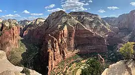 Observation Point is a 6,507-foot (1,983 m) elevation Navajo Sandstone feature located in Zion National Park, in Washington County of southwest Utah, United States.[2] Observation Point is situated at the north end of Zion Canyon, towering 2,100 feet (640 meters) above the canyon floor and the North Fork of the Virgin River which drains precipitation runoff from this viewpoint. A popular 8-mile round-trip trail climbs from the Weeping Rock trailhead along Zion Canyon Road to reach the top.[3] Neighbors visible from the point include The Great White Throne, Cathedral Mountain, Angels Landing, and Cable Mountain. This geographical feature's name was officially adopted in 1934 by the U.S. Board on Geographic Names.[2]