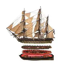 ![]() 1⁄48 scale model of the Océan-class 120-gun ship of the line Commerce de Marseille, on display at Marseille naval museum; and Half-hull of a 120-gun ship of the line on display at Brest naval museum. | |