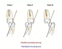 - Class III: If the mesiobuccal cusp of the maxillary first molar occludes posterior to the buccal groove of the mandibular first molar[8]