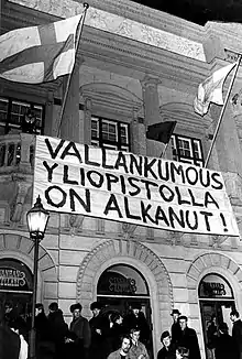 The dissidents' main demands concerned democratic reforms to the university's administration. However, some of the participants also demanded the founding of Marxist-Leninist study-circles in the departments and faculties, abolishing compulsory membership of the Student Union and changing the political alignment of the monthly student magazine Ylioppilaslehti.[3] Banners carrying these proclamations were hung from the Student House's balcony and speeches were made. However, not all of the youth involved were communists; people aligned with the centrist-agrarian Centre Party participated as well.[1]