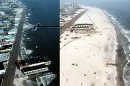 Since 1951, the beach has been replenished more than 40 times, potentially the most of any beach in the country. This is due to erosion caused by storms, and in an extreme instance of erosion, a $5 million replenishment project in 1982 had largely disappeared within two and a half months. During the 1960s and 1970s, the city owned its own dredge, but ceased replenishment projects when it could not secure permits for dredging the lagoons.[59] Since 1992, the United States Army Corps of Engineers has handled responsibility for beach nourishment projects, periodically adding 1,100,000 cubic yards (840,000 m3), roughly every three years, using the shoal area about 5,000 feet (1,500 m) offshore the Great Egg Harbor Inlet. The project and funding was authorized in the Water Resources Development Act of 1986,[54] and the most recent replenishment was completed in December 2017.[60] After Hurricane Sandy in 2012, the Army Corps completed the city's largest beach replenishment since 1993, adding 1,800,000 cubic yards (1,400,000 m3) of sand to replenish the eroded beaches.[54]