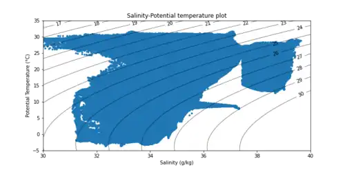 In the ocean, a specific range of temperature and salinity occurs. Using the GODAS Data,[4] a temperature-salinity plot can show the possibilities and occurrences of the different combinations of salinity and potential temperature.