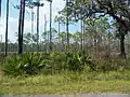 Ochlockonee River State Park's primary ecologic biome is East Gulf coastal plain near-coast pine flatwoods, with some live oak thickets also present within the park boundaries;[4][2] several species of golden wiregrass can be found in abundance within the park.[6] The park is considered to be one of the best remaining examples of a natural flatwoods environment in the state,[7] and it contains a significant habitat for the endangered red-cockaded woodpecker, which nests in longleaf pines. In addition to a large number of other birds,[5] bobcat, American black bear, white-tailed deer, gopher tortoise and fox squirrel are also resident;[6] a population of white-colored squirrels, a genetic mutation of the eastern gray squirrel,[7] are often found at the park as well.[8]