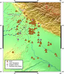 Artefacts of this culture show similarities with both the Late Harappan culture and the Vedic culture,[5][6] and the OCP may have been infiltrated by an Indo-Iranian migration into the India subcontinent coming into contact with Late Harappans.[6]