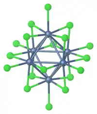 With metals in group 4 or 5 a so-called edge-capped octahedral clusters are more common. Twelve halides are located along the edge of the octahedron and six are terminal. Examples of this structure type are tungsten(III) chloride, Ta6Cl14(H2O)4,[5][6] Nb6F15, and Nb6F182−.[1]