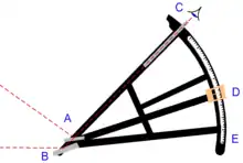 In the drawing to the right, the horizon element (B) could be a mirror or a prism. On the index arm, the index mirror (A) rotated with the arm. A sighting telescope was mounted on the frame (C). The index did not use a vernier or other device at the scale (D). Smith called the instrument's index arm a label, in the manner of Elton for his mariner's quadrant.[7]