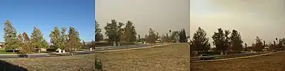 The October 2007 fires occurred following an extremely dry previous winter: in Los Angeles, with only 3.21 inches or 81.5 millimetres of rainfall between July 2006 and June 2007, it was the driest “rain year” on record by 1.14 inches (29.0 mm).[34] The record drought was exacerbated by the seasonal Santa Ana winds, blowing at an abnormally high strength. This combination of wind, heat, and dryness turned the chaparral into fire fuel. Officials believed that some of the fires generated their own winds, similar to the Oakland firestorm of 1991. The effects of the smoke were felt as far away as Brentwood in the East Bay, near Stockton, where it impacted local weather. High-speed Santa Ana winds also rendered the use of dropping water from fire fighting aircraft inefficient: until such winds abate, most payloads of water are just dispersed by the wind over an area so large that the water evaporates before it can reach a large fire on the ground.