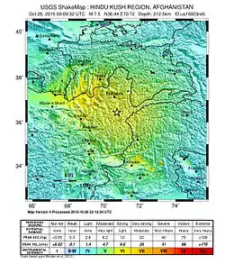 The October 2015 Hindu Kush earthquake was a magnitude 7.5 earthquake[1][2] that struck South Asia on 26 October 2015, at 13:39 AFT (14:09 PKT; 14:39 IST; 09:09 UTC)[1][2][3] with the epicenter 45 km north of Kuran wa Munjan, Afghanistan,[4][5] at a depth of 212.5 km.[6]