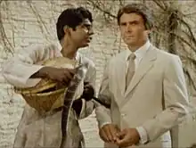 In a bit of diegesis that "breaks the fourth wall", Vijay signals his affiliation to MI6 by playing the "James Bond Theme" on a recorder while Bond is disembarking from a boat in the harbour near the City Palace.[25] Like his fictional counterpart, the real Vijay had a distinct fear of snakes and found it difficult to hold the basket during filming.[9]