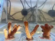 Oculina arbuscula is a branching temperate coral found along the east coast of the United States from Florida to North Carolina.[1] It has a facultative symbiosis with microalgae of the family Symbiodiniaceae. Unlike tropical corals, O. arbuscula can survive without its algal endosymbionts by switching to a predominantly heterotrophic feeding strategy. Symbiotic colonies are typically found in shallower waters due to light availability, whereas aposymbiotic (without symbionts) or mixed colonies are found as deep as 200m.[2] The ability of O. arbuscula to exist in different symbiotic states makes it a good model system for studying the cnidarian-dinoflagellate symbiosis.