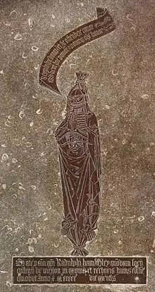 Between 1884 and 1886, the church was heavily restored under the direction of the architect E.G. Bruton. The bell tower and the north wall of the chancel were rebuilt, the vestry and north aisle were added and several windows inserted. Inside the church are two unusual monuments. The first is an early 16th-century monumental brass in memory of Ralph Hamsterley, who had been parish priest and died in 1518. It is a cadaver monument, showing his corpse in its burial shroud, which is a style unusual for monumental brasses in England. Elsewhere there is an example from the late 15th century, also in memory of a parish priest, in the parish church at Lytchett Matravers in Dorset.