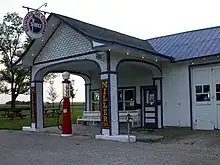 Early Odell was a railroad town and a grain collection point. It was surrounded by some of the richest agricultural land in the United States. By the late 1870s over a million and a half bushels of grain were being shipped from Odell. In 1877 a newspaper, the Odell Herald, was established.[17] In May 1886 several buildings in Odell were destroyed by a powerful tornado.[18] By 1900 there were 1,000 people in the town, and since that date its population has remained at about that number. The major change came not in population, but in transportation, as Odell made the transition from a railroad to a highway town. In 1921 the state put under contract a highway paving project for what at first was known as the "Chicago-Springfield East St. Louis Road".[19] Paving was finished through Odell in 1922. The designation of the road was soon changed to Route 4. In 1926, what was substantially the same road became Route 66. At first all of these roads passed through the center of Odell, and by 1933 the local citizens became so frustrated by the inability of people to cross the road that they constructed a pedestrian underpass beneath the highway.[20] In 1946 the problem was eased when a bypass was built around the town. In 1932 Patrick O'Donnell built the Standard Oil and Gasoline Station to serve traffic along the highway; this building has now been carefully restored and has become a popular stop for visitors touring Route 66. The station was added to the National Register of Historic Places in 1997. In 1964 the first stage of Interstate 55 was completed past Odell.[21] It was improved in the 1970s. This highway substantially paralleled both the earlier roads and the original route of the Chicago and Mississippi Railroad.