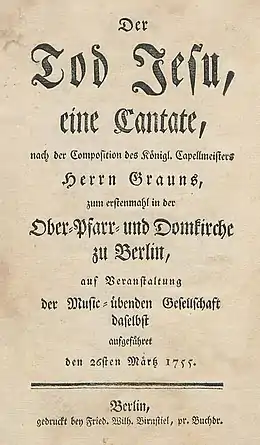 In 1755 Birnstiel published Karl Wilhelm Ramler's libretto of Carl Heinrich Graun's cantata Der Tod Jesu. The music of this Passion setting was published five years later by Johann Gottlob Immanuel Breitkopf.[6]