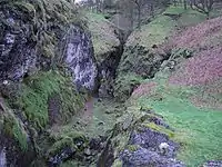 The site of Odin Mine is owned by the National Trust. It consists of a limestone gorge, the original early workings before they went underground to follow the veins of ore. It looks like a natural limestone ravine with the workings now disguised by natural vegetation. To the left of the gorge is the two-metre-wide Odin Cave, which goes about 10 metres underground. The remaining spoil heaps are a protected archaeological site and support a wide variety of plants including Birdsfoot Trefoil, Eyebright, Wild thyme and the Common spotted orchid. Some plants called metallophytes can tolerate the high levels of metal in the soil: these include Spring Sandwort and Alpine Scurvy-grass.[9] A gritstone crushing wheel, 1.75 metres in diameter with its iron tyre and circular iron track, used to crush the ore, can still be seen at the site. The crusher was built in 1823 at a cost of £40.[10]