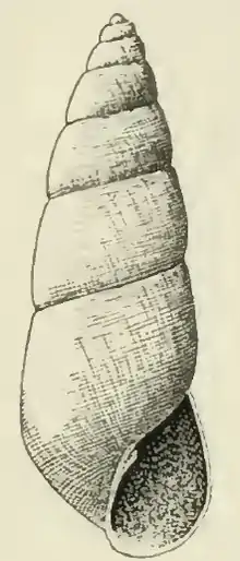 The shell is very elongate-conic, yellowish-white. It measures 5.6 mm. The small nuclear whorls are immersed in the first of the succeeding turns, above which only half of the last volution projects. The seven post-nuclear whorls are situated high between the sutures. They are appressed at the summit and slightly rounded. They are marked by feeble lines of growth, and many sub-equal and subequally spaced, strongly incised, spiral lines. About 25 of these occur between the sutures of the fourth whorl and about 30 between the summit and the periphery on the penultimate turn. The sutures are strongly impressed. The periphery of the body whorl is somewhat angulated. The base of the shell is well rounded, moderately long, marked like the spire. The aperture is elongate-oval, slightly effuse anteriorly. The posterior angle is acute. The thin outer lip is decidedly sinuous, bent back at the posterior angle to almost form a notch. The inner lip is moderately long, oblique, slightly curved and slightly revolute, provided with a strong fold at its insertion. The parietal wall glazed with a thin callus.[3]