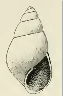 The elongate-ovate shell is milk-white. The shell measures 3.1 mm. The nuclear whorls are small, obliquely immersed in the first of the succeeding turns, above which only half of the last volution projects. The projecting portion extends considerably beyond the outline of the post-nuclear spire. The five post-nuclear whorls are slightly rounded, somewhat constricted at the summit. They are marked by almost vertical lines of growth and very regular, closely spaced, wavy, spiral striations; of the latter about 25 occur between the sutures and the third whorl. The periphery of the body whorl is decidedly inflated and strongly rounded. The base of the shell is moderately long, well rounded, with a narrow umbilicus, marked like the spire. The sutures are moderately impressed. The aperture is large, slightly effuse anteriorly. The posterior angle is acute. The outer lip is very thin. The inner lip is quite long, decidedly flexuose and somewhat reflected. It is provided with a strong fold opposite the umbilical chink. The parietal wall is glazed with a thin callus.[3]