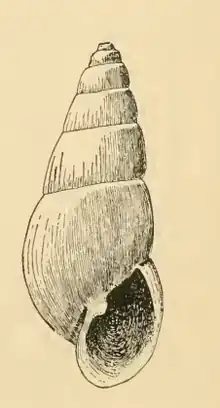 The regularly conic, yellowish white shell is umbilicated. It measures 4 mm. The whorls of the protoconch are apparently planorboid, very obliquely, almost completely, immersed in the first of the later whorls, only a portion of the last volution being visible. The six whorls of the teleoconch are rather high between the sutures, slightly rounded (almost flattened), and subtabulately shouldered at the summits. They are marked by fine lines of growth and very many subequal, wavy, closely spaced striations. The whorls are somewhat angulated at the periphery and the summit of the succeeding whorls falls a little anterior to the periphery, which gives the sutures a decidedly channeled effect. The base of the body whorl is large, rather prolonged, well rounded. It is marked by spiral striations which are equally as abundant as those between the sutures but somewhat stronger. The suboval aperture is moderately large, and somewhat effuse anteriorly. The posterior angle is obtuse. The outer lip is thin. The columella is slender, curved, reflected partly over the moderately large umbilicus and provided with a strong, acute, oblique fold near its insertion. The parietal wall is covered by a thin callus.[1]