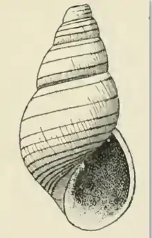 The yellowish-white shell is moderately large and measures 3.9 mm. It is elongate-ovate. The nuclear whorls are decollated. The six post-nuclear whorls are well rounded, appressed at the summit. They are marked by four equally strong but not equally spaced, incised, spiral lines between the sutures. The fourth of these is immediately above the periphery, while the first is as far below the summit as the third is posterior to the fourth. The second line divides the space between the first and third into equal halves, which are about one and a half times as wide as the spaces included between the third and fourth incised spiral. In addition to the spiral sculpture the whorls are crossed by numerous, fine, decidedly retractive, incremental lines. The periphery of the body whorl is somewhat inflated, well rounded. The base of the shell is moderately long and moderately rounded, crossed by 8 strongly incised, equal, spiral lines, which are a little stronger than those occurring on the spire. These lines become exceedingly closely spaced between the periphery and the umbilical area. The axial sculpture on the base is of the same character and strength as that appearing on the spire. All of the incised, spiral lines on base and spire are crossed by very slender, axial threads, which lend these channels a somewhat pitted appearance. The sutures are well impressed. The aperture is moderately large, oval, and effuse anteriorly. The posterior angle is acute. The outer lip is thin, showing the external sculpture within. The inner lip oblique, moderately long, somewhat reflected, and re-enforced for the greater part of its length by the attenuated base, provided with an oblique fold at its insertion. The parietal wall is glazed with a thin callus.[3]
