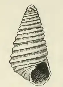 The bluish-white shell is moderately large, measuring 3.1 mm. Its shape is very elongate-ovate, with a very regular, conic spire. The nuclear whorls are small, obliquely immersed in the first of the succeeding turns, above which a portion of the last two volutions only project. The six post-nuclear whorls are flattened. They are marked by three equal and equally spaced, strong, spiral keels, of which one is at the summit and another about as far above the periphery as the space which separates it from the median keel. The spaces between the spiral keels are deep, rounded grooves, almost as wide as the keels and crossed by numerous, slender, axial threads. The sutures are deeply channeled. These channels are a little more profound than those between the keels. The periphery of the body whorl is marked by a sulcus. The base of the shell is short, well rounded, and marked by four subequal and subequally spaced, spiral cords, the spaces between which appear as rather broad sulci and are crossed by slender axial threads. The ovate aperture is small and very oblique. The posterior angle is obtuse. The outer lip is thin, showing the external sculpture within. The inner lip is short, curved, slightly revolute, provided with a strong fold at its insertion. The parietal wall is glazed with a thin callus.[4]