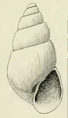 Shell moderately large measuring 5 mm. It is yellowish-white, very elongate-ovate. The nuclear whorls are small, very obliquely immersed in the first of the succeeding turns, above which the tilted edge of the last volution only projects. The six post-nuclear whorls are subtabulately shouldered at the summit and well-rounded. They are apparently marked by incremental lines only. The sutures are strongly constricted. The periphery of the body whorl is somewhat inflated, well rounded. The base of the shell is short, well rounded and broadly umbilicated. It is marked like the spire. The ovate aperture moderately large. The posterior angle is obtuse. The outer lip is evenly curved. The inner lip is sinuous, reflected over, but not adnate to the base. The columella is provided with a strong oblique fold, which is about one-third of the distance of the length of the inner lip anterior to the insertion of the inner lip. The position of the columellar fold will distinguish this species at a glance from all the other California shells. The parietal wall is covered with a thick callus.[3]