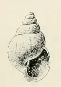 The yellowish-white shell measures 10.2 mm and is one of the largest in this genus. It is very thin, broadly conic, umbilicated. It is marked by subobsolete, subequal, and subequally spaced spiral wrinkles, about fifteen of which may be seen on the body and base of the body whorl. In addition to these wrinkles, many faint, closely placed spiral and vertical grooves are present. The nuclear whorls are small, numbering about two and one-half. They form a depressed spire, the axis of which is almost at right angles to the axis of the latter whorls. The six post-nuclear whorls are very wide, inflated, well rounded, faintly shouldered at the summit. The sutures are well marked and simple. The periphery and the base of the body whorl are inflated, well rounded, the latter decidedly contracted and narrowly umbilicated. The aperture is large, suboval, somewhat effuse anteriorly. The posterior angle is obtuse. The outer lip is thin. The columella is straight, obliquely inserted, revolute, not reinforced by the base, with an oblique weak fold near its insertion. The parietal wall is apparently without a callus.[3]