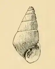 The small shell measures 2.1 mm. It is umbilicated, elongate-ovate conic, semitransparent, polished. The 2½ whorls of the protoconch are moderately large, helicoid, elevated, about one-fifth immersed in the first of the succeeding whorls and having their axis at a right angle to them. The five whorls of the teleoconch are flattened, angulated at the periphery and weakly shouldered at the summit; the latter falls somewhat anterior to the periphery of the preceding whorl and lends to it a somewhat constricted appearance at the well-impressed suture. The whorls are marked by extremely fine, closely placed, wavy spiral striations, which are visible only under very high magnification. The periphery of the last whorl is somewhat angulated. The base of the shell is very broad, gently rounded, somewhat pinched at the narrow umbilicus. The aperture is elongate-ovate, somewhat prolonged at the junction of the outer lip and columella. The posterior angle is acute. The outer lip is thin, somewhat effuse. The slender columella is decidedly curved, slightly revolute, provided with a prominent oblique fold at its insertion. The parietal wall is covered by a strong callus which lends the periostracum an almost continuous appearance.[1]